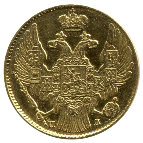Реверс: вдоль края монеты разделенная вверху розеткой надпись «ЧИСТОГО ЗОЛОТА 1 ЗОЛОТНИК 39 ДОЛЕЙ», в середине в точечном ободке обозначение номинала цифра «5», слева и справа звездочки, ниже слово «РУБЛЕЙ», под ним две направленные в разные стороны фигурные черты, ниже год выпуска монеты «1838», под ним обозначение монетного двора «СПБ».