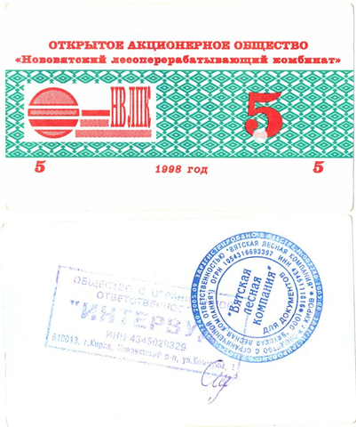 5 рублей Нововятский ЛПК чек 1998 (2 печати)