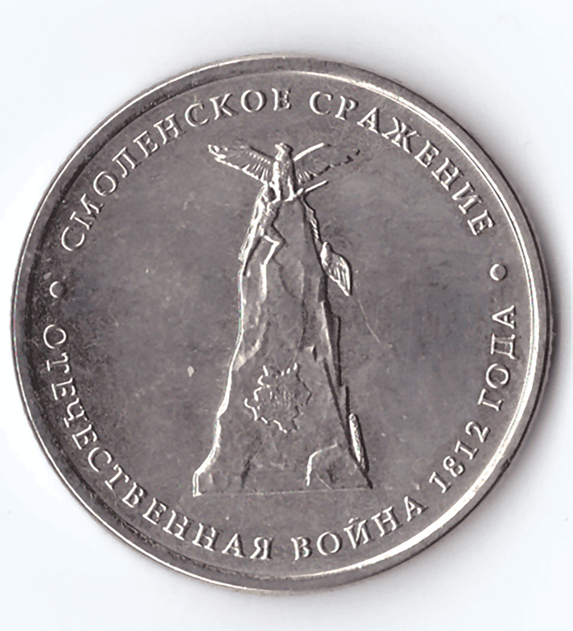 Монета выпущена в 2012 году в честь 200-летия победы в Отечественной Войне 1812 Центральным Банком РФ. Входит в серию из 10 монет под названием «Сражения и знаменательные события Отечественной войны 1812 года и заграничных походов русской армии 1813-1814 годов». Сражение произошло в августе. Французы не смогли взять Смоленск - город сгорел. На реверсе изображен памятник солдатам, защищавшим город.