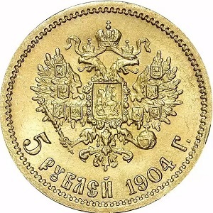 Аверс: в середине Малый Государственный Герб Российской империи, под ним вдоль края монеты номинал «5 РУБЛЕЙ» и год выпуска монеты «1904 Г.».
