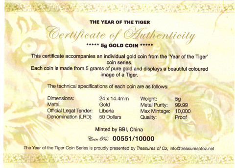 50 долларов. Год Тигра. Либерия. 2010 год. PROOF