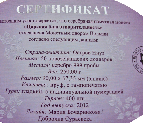 50 долларов. Царская благотворительность. Ниуэ. Серебро. 2012 год