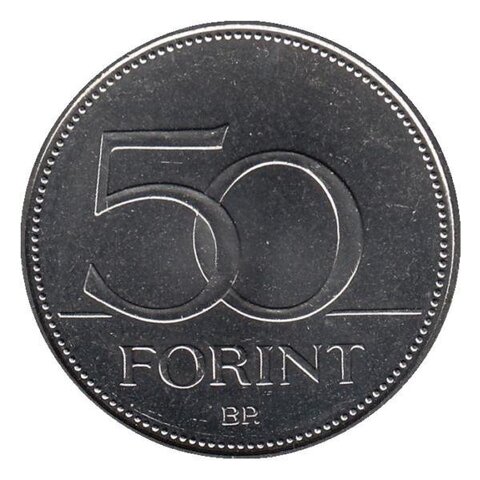На аверсе: в центре номинал в две строки:“50”, “FORINT”; внизу знак Венгерского монетного двора “В.Р.”.