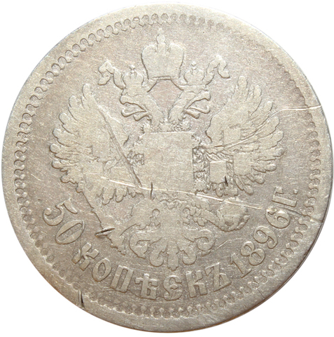 Аверс: в середине Малый Государственный Герб Российской империи, под ним вдоль края монеты слева номинал «50 КОПЕЕК», в середине цветочная розетка, справа выпуска монеты «1896 Г.».