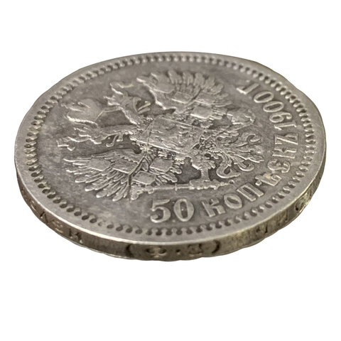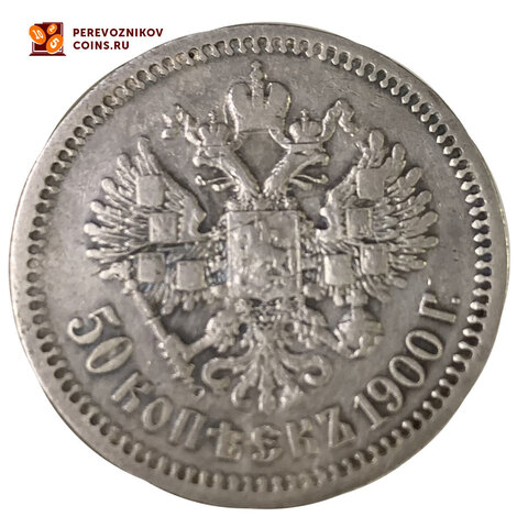 Аверс: в середине Малый Государственный Герб Российской империи, под ним вдоль края монеты слева номинал «50 КОПЕЕК», в середине цветочная розетка, справа выпуска монеты «1900 Г.».