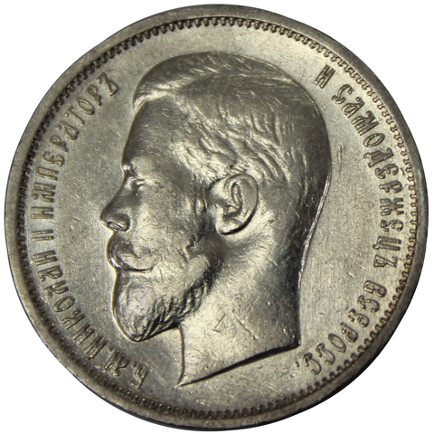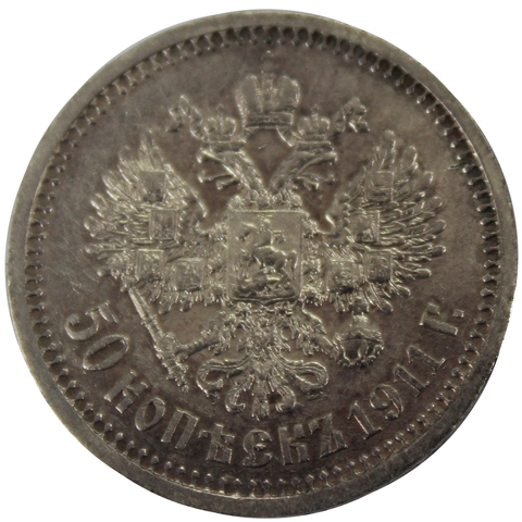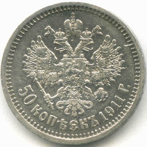 Реверс: В центре изображен Малый Государственный Герб Российской империи - двуглавый орёл, головы которого увенчаны двумя коронами, третья, большая корона над ними. Все они соединены орденской лентой ордена Св. Апостола Андрея Первозванного. На груди орла расположен Московский герб, в щите изображен Георгий Победоносец с копьем поражающий дракона. Вокруг щита цепь ордена Св. Апостола Андрея Первозванного. На крыльях изображены гербы: Царства Казанского, Польского, Херсонеса Таврического, Астраханского, Сибирского, Грузинского и герб соединенных княжеств Киевского, Новгородского и Владимирского — по 4 на каждое крыло. В правой лапе орла – скипетр, в левой – держава. Под ним слева направо изображены: номинал - надпись «50 копеек» и дата выпуска «1911 Г.». По окружности канта имеются рельефные элементы, выполненные в виде зубцов.