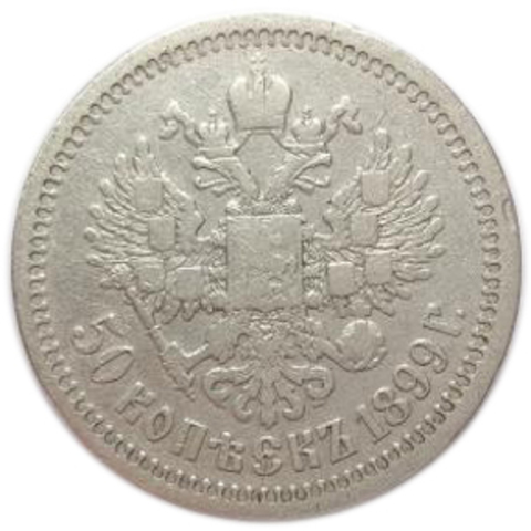 Аверс: в середине Малый Государственный Герб Российской империи, под ним вдоль края монеты «50 КОПЕЕК 1899 Г.».