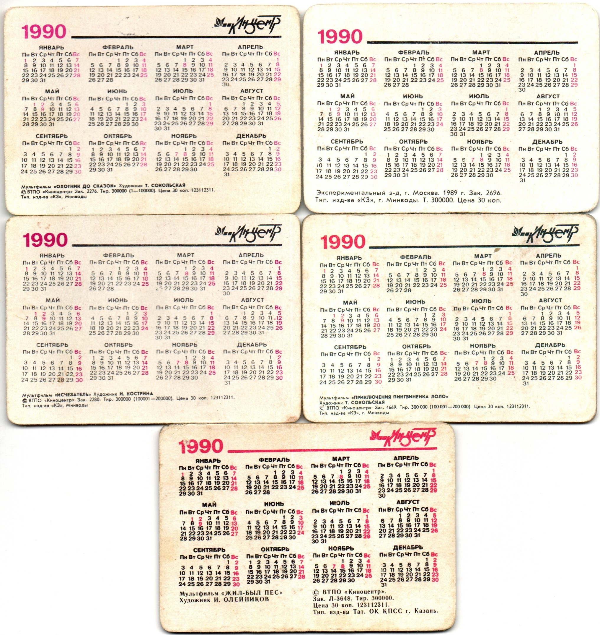 № 50 Набор из 5 стерео Календариков. Мультфильмы СССР 1990 г. Стерео мультфильмы : Лебедь, рак и щука / Приключения пингвиненка Лоло / Исчезатель / Охотник до сказок / Жил был пес / . Карманный календарик переливной объемный 3D. СССР. Художники СССР. Состояние на фото