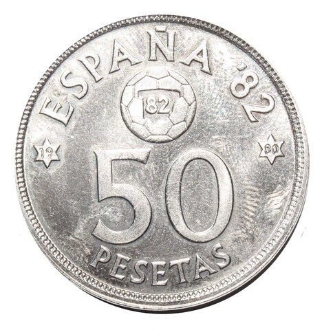 50 песет 1980 год. Испания. Чемпионат мира по футболу в Испании 1982. Футбол. Спорт. 80 внутри звезды
