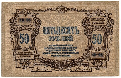 50 рублей 1919 год - Серия АБ-08 - Юг России - Локальный выпуск