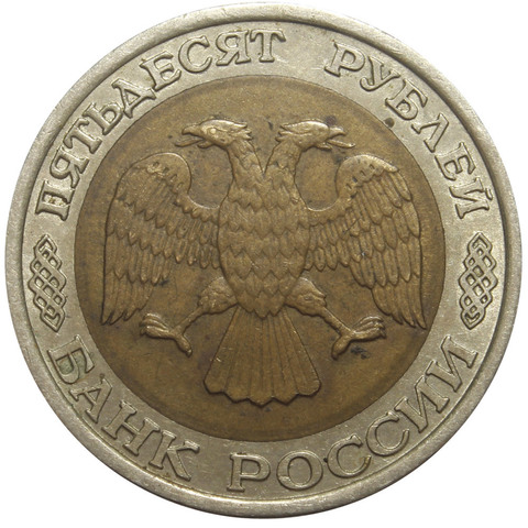 Аверс: вверху вдоль канта обозначение достоинства монеты «ПЯТЬДЕСЯТ РУБЛЕЙ» ниже справа и слева орнамент, внизу надпись «БАНК РОССИИ», в середине двуглавый орел с опущенными крыльями, перья без просечек.