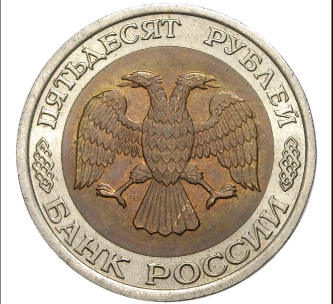 Аверс: вверху вдоль канта обозначение достоинства монеты «ПЯТЬДЕСЯТ РУБЛЕЙ» ниже справа и слева орнамент, внизу надпись «БАНК РОССИИ», в середине двуглавый орел с опущенными крыльями, перья без просечек.
