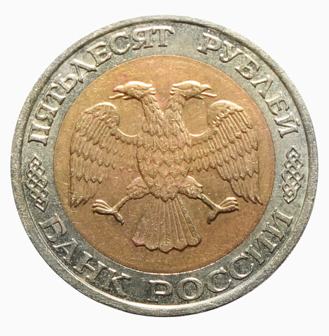 Вверху вдоль канта обозначение достоинства монеты «ПЯТЬДЕСЯТ РУБЛЕЙ» ниже справа и слева орнамент, внизу надпись «БАНК РОССИИ», в середине двуглавый орел с опущенными крыльями, перья без просечек.