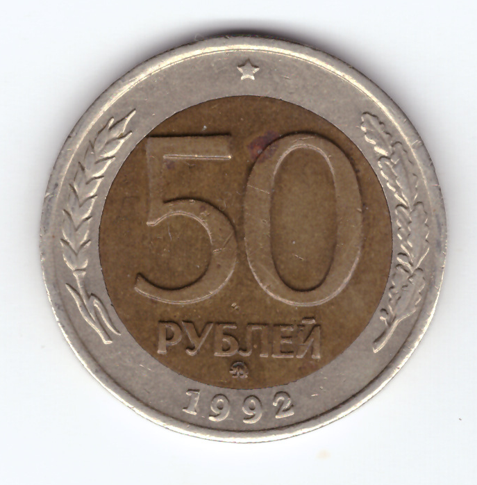 Сверху пятиконечная звезда, в центре немного смещенная вверх цифра «50» обозначающая номинал монеты, ниже слово «РУБЛЕЙ», под ним монограмма монетного двора (ММД). Внизу у края монеты год выпуска «1992». Слева колос, справа дубовая ветвь.