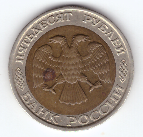 Вверху вдоль канта обозначение достоинства монеты «ПЯТЬДЕСЯТ РУБЛЕЙ» ниже справа и слева орнамент, внизу надпись «БАНК РОССИИ», в середине двуглавый орел с опущенными крыльями, перья без просечек.