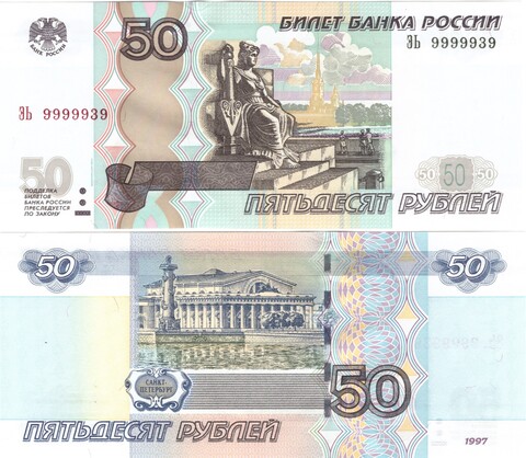 50 рублей 1997 г. Красивый номер 9999939. Пресс UNC