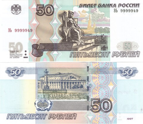 50 рублей 1997 г. Красивый номер 9999949. Пресс UNC