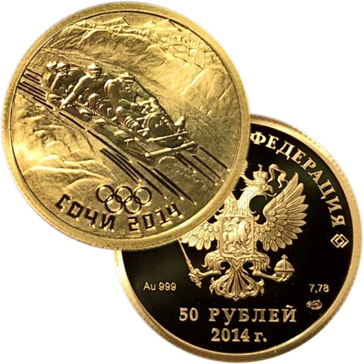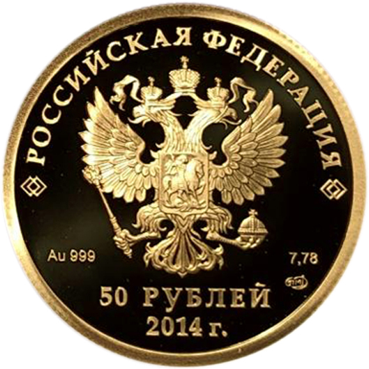 Аверс: сверху вдоль края монеты слова «РОССИЙСКАЯ ФЕДЕРАЦИЯ» под ними орел со скипетром и державой с Государственного герба Российской Федерации, слева от орла химическое название «Au» и проба «999» металла, справа от орла чистый вес находящегося в монете драгоценного металла «7,78» и под ним монограмма монетного двора «СПМД», ниже обозначение достоинства монеты «50 рублей» и под ним год проведения XXII Олимпийских зимних игр в г. Сочи «2014 г.».