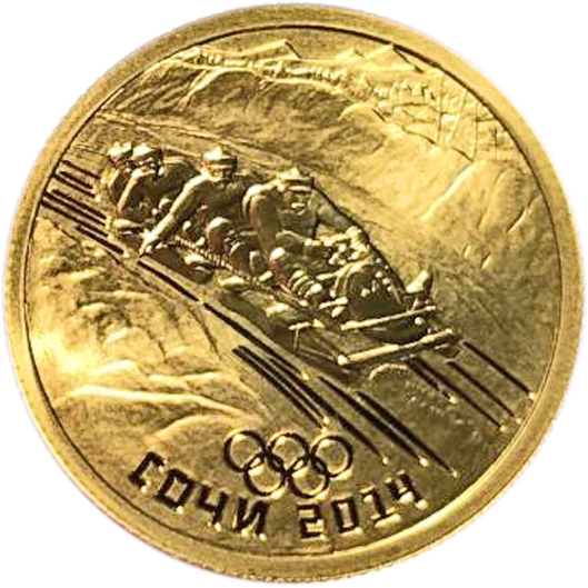 Реверс: в центре матового диска - рельефное изображение четырех спортсменов, спускающихся на санях-бобах по трассе, обрамленной с обеих сторон снежными сугробами. На втором плане вверху - далекие горы, внизу - пять Олимпийских колец, под ними воль канта - надпись, выполненная в технике "пруф": "СОЧИ 2014".