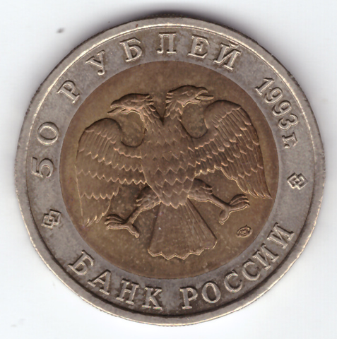 На аверсе монеты - эмблема Банка России (двуглавый орёл художника И. Билибина), под ним справа - товарный знак монетного двора, по окружности надписи: вверху - "50 РУБЛЕЙ 1993 г.", внизу - "БАНК РОССИИ"