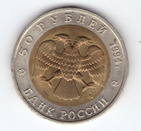 На аверсе монеты - изображение двуглавого орла (художник И. Билибин), по окружности надписи, разделённые орнаментом: вверху - "ПЯТЬДЕСЯТ РУБЛЕЙ" "1994", внизу - "БАНК РОССИИ".