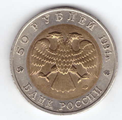 На аверсе монеты - изображение двуглавого орла (художник И. Билибин), по окружности надписи, разделённые орнаментом: вверху - "ПЯТЬДЕСЯТ РУБЛЕЙ" "1994", внизу - "БАНК РОССИИ".