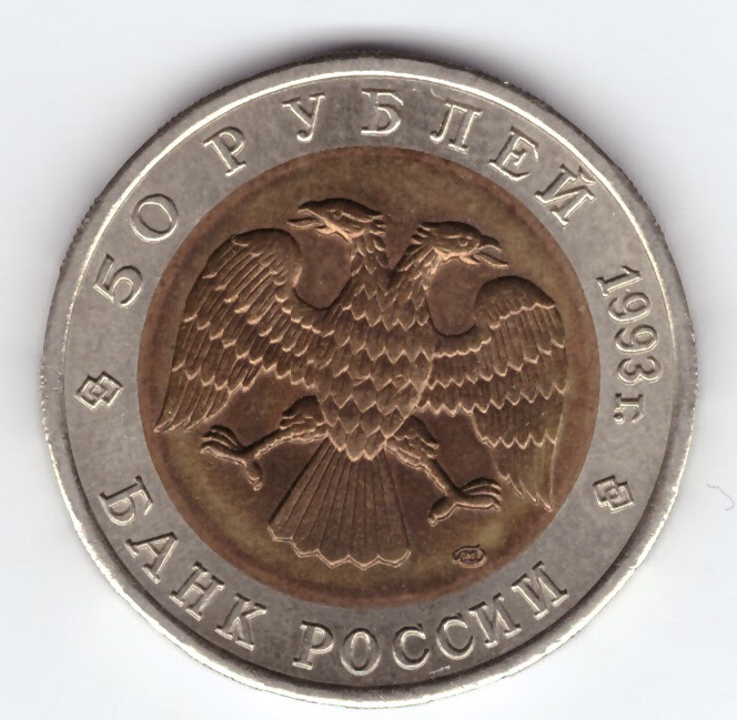 На аверсе монеты - эмблема Банка России (двуглавый орёл художника И. Билибина), под ним справа - товарный знак монетного двора, по окружности надписи: вверху - "50 РУБЛЕЙ 1993 г.", внизу - "БАНК РОССИИ"