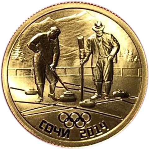 Реверс: в центре матового диска - два спортсмена на ледовой площадке, рядом с ними - четыре камня (биты), один из спортсменов трет щёткой лед перед камнем, второй справа стоит с щёткой в руке, на втором плане - заснеженные горы, у подножия которых справа и слева - несколько хвойных деревьев; внизу - пять Олимпийских колец, под ними вдоль канта - надпись, выполненная в технике "пруф": "СОЧИ 2014".