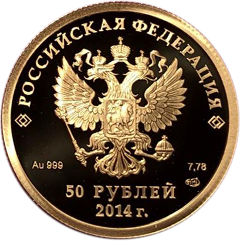 Аверс: сверху вдоль края монеты слова «РОССИЙСКАЯ ФЕДЕРАЦИЯ» под ними орел со скипетром и державой с Государственного герба Российской Федерации, слева от орла химическое название «Au» и проба «999» металла, справа от орла чистый вес находящегося в монете драгоценного металла «7,78» и под ним монограмма монетного двора «СПМД», ниже обозначение достоинства монеты «50 рублей» и под ним год проведения XXII Олимпийских зимних игр в г. Сочи «2014 г.».