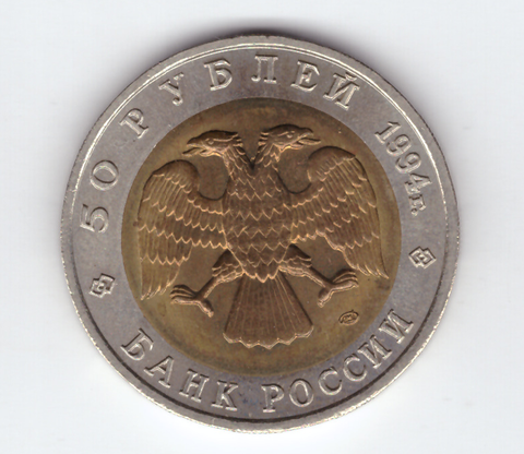 На аверсе монеты - изображение двуглавого орла (художник И. Билибин), по окружности надписи, разделённые орнаментом: вверху - "ПЯТЬДЕСЯТ РУБЛЕЙ" "1994", внизу - "БАНК РОССИИ".