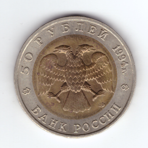 На аверсе монеты - изображение двуглавого орла (художник И. Билибин), по окружности надписи, разделённые орнаментом: вверху - "ПЯТЬДЕСЯТ РУБЛЕЙ" "1994", внизу - "БАНК РОССИИ".