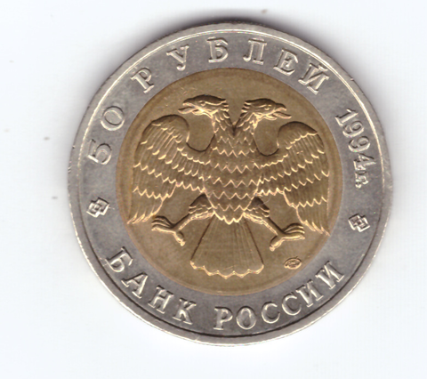 На аверсе монеты - изображение двуглавого орла (художник И. Билибин), по окружности надписи, разделённые орнаментом: вверху - "ПЯТЬДЕСЯТ РУБЛЕЙ" "1994", внизу - "БАНК РОССИИ".