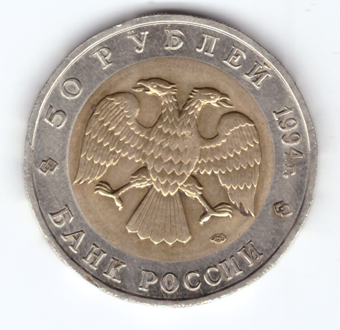 На аверсе монеты - изображение двуглавого орла (художник И. Билибин), по окружности надписи, разделённые орнаментом: вверху - "ПЯТЬДЕСЯТ РУБЛЕЙ" "1994", внизу - "БАНК РОССИИ".