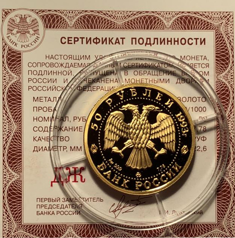 Аверс: вверху вдоль канта номинал «50 рублей» и год выпуска «1993 г.», внизу слова «БАНК РОССИИ». В середине в ободке из точек двуглавый орел под ним с внутренней стороны точечного ободка слева химическое название «Au» и проба «999» металла, далее направо монограмма монетного двора «ММД» и чистый вес находящегося в монете драгоценного металла «7,78».