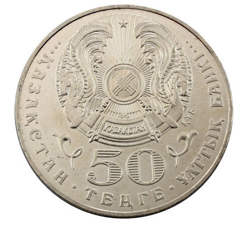 Аверс: в верхней части изображен герб Республики Казахстан и под ним надпись - "50 Теңге", расположенная в две строки. Слева и справа от номинала изображен элемент национального орнамента. По окружности надпись - "Қазақстан Ұлттық Банкi".