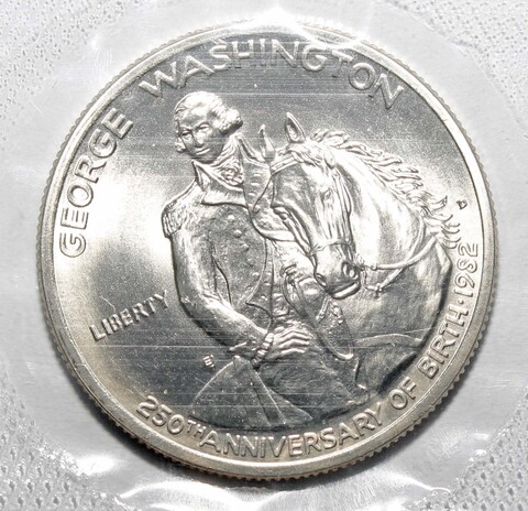 Аверс: на диске монеты изображен Джордж Вашингтон на лошади. Сверху надпись: "GEORGE WASHINGTON", слева: "LIBERTY" и снизу: "250 Anniversary OF BIRTH 1982"