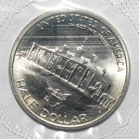Реверс: в центре диска монеты изображен восточный фасад дома Вашингтона в Маунт-Верноне. Чуть ниже изображение геральдического орла. Сверху полукругом в две строки надписи: "UNITED STATES OF AMERICA" и "IN GOD WE TRUST". Снизу надпись: "HALF DOLLAR"