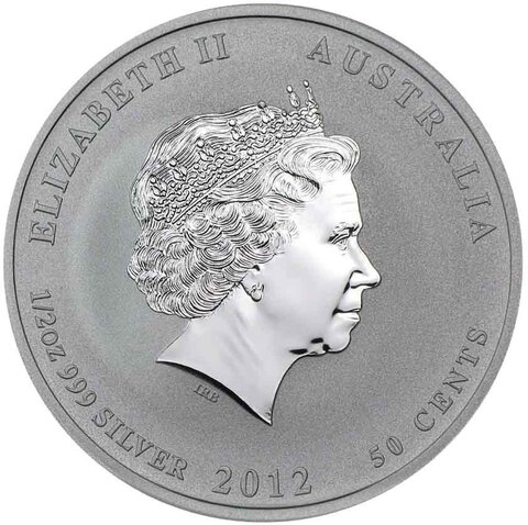 Аверс: В центре – рельефное изображение портрета Ее Величества Елизаветы II. По окружности надписи: ELIZABETH II (Елизавета II), AUSTRALIA (Австралия), номинал 50 CENTS (50 центов), год выпуска 2012, 1/2 oz (1/2 унции = 15,55 гр.) и характеристика металла 999 SILVER (серебро 999 пробы).