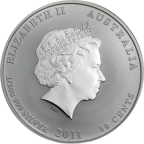 Аверс: В центре – рельефное изображение портрета Ее Величества Елизаветы II. По окружности надписи: ELIZABETH II (Елизавета II), AUSTRALIA (Австралия), номинал 50 CENTS (50 центов), год выпуска 2011, 1/2 oz (1/2 унции = 15,55 гр.) и характеристика металла 999 SILVER (серебро 999 пробы).