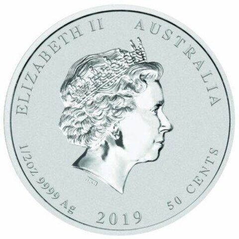 На аверсе изображен профиль королевы Елизаветы II. Сверху надписи: «ELIZABETH II» (Елизавета II) и «AUSTRALIA» (Австралия). Также внизу указаны вес (1/2 oz – 1/2 унция), проба (9999), название металла (Ag - серебро), год (2019) и номинал монеты – «50 cents» - 50 австралийских центов.