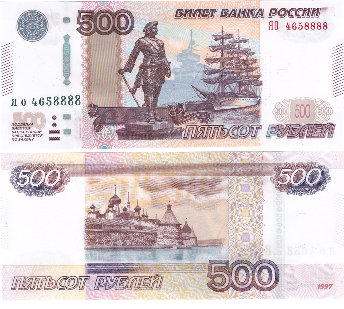 500 рублей 1997 г. Модификация 2010 г. Серия ЯО 4658888 Пресс