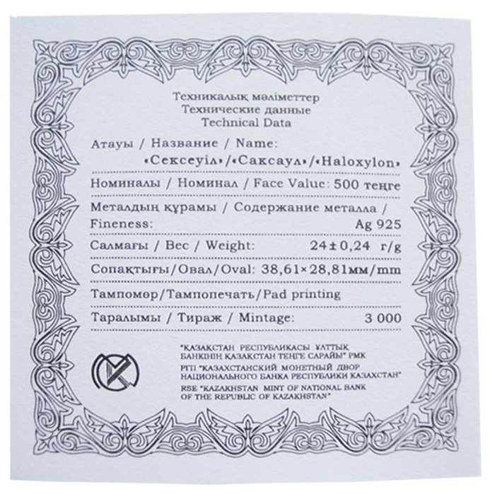 На реверсе монеты изображен цветущий в пустыне саксаул и число «2016», обозначающее год чеканки. По овалу монеты надпись «СЕКСЕУIЛ» на государственном языке и «HALOXYLON» на латинском – зоологическое название вида. С правой стороны монеты, будто под увеличительным стеклом, изображена одна из ветвей цветущего саксаула. Цветовое решение ветви выполнено посредством технологии тампопечати.