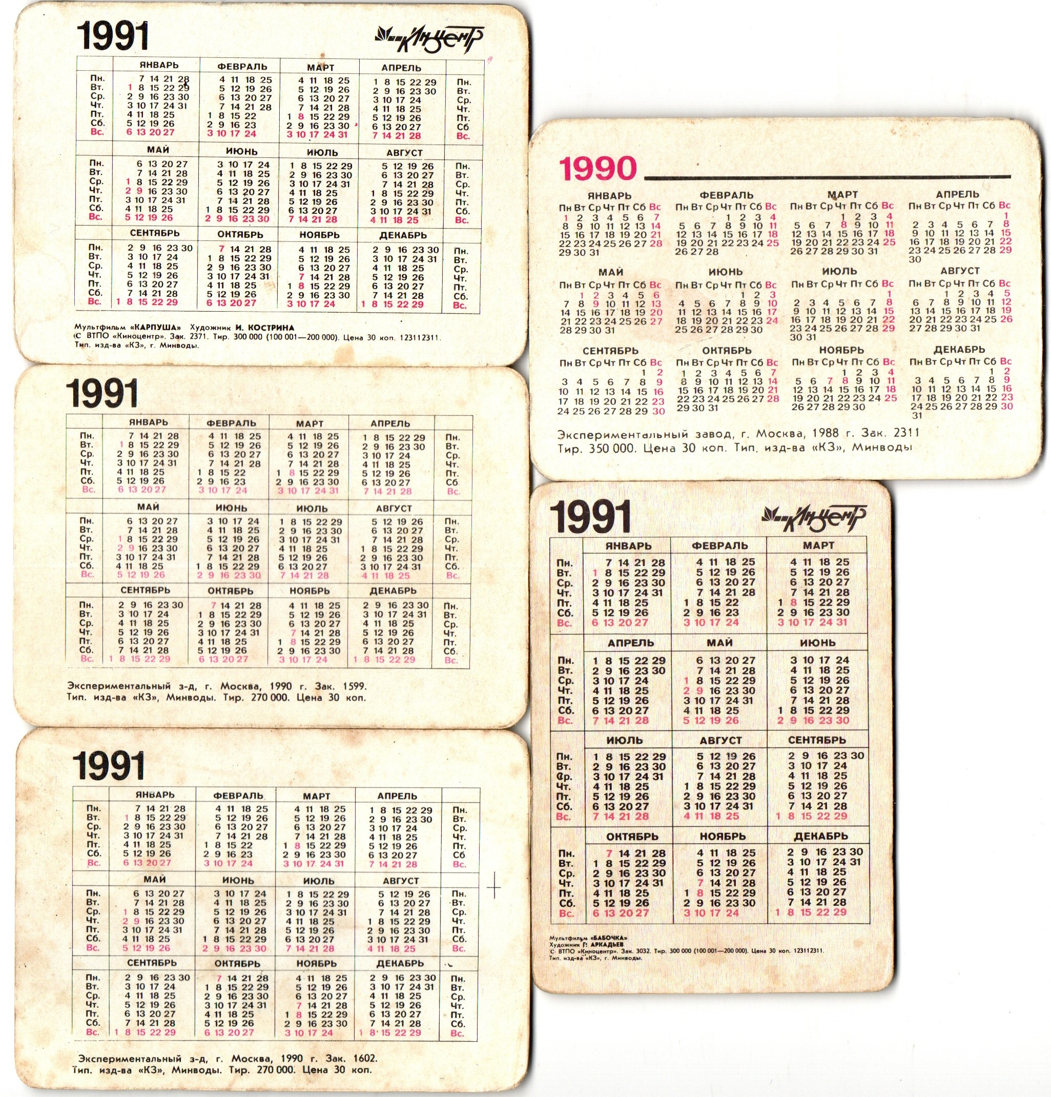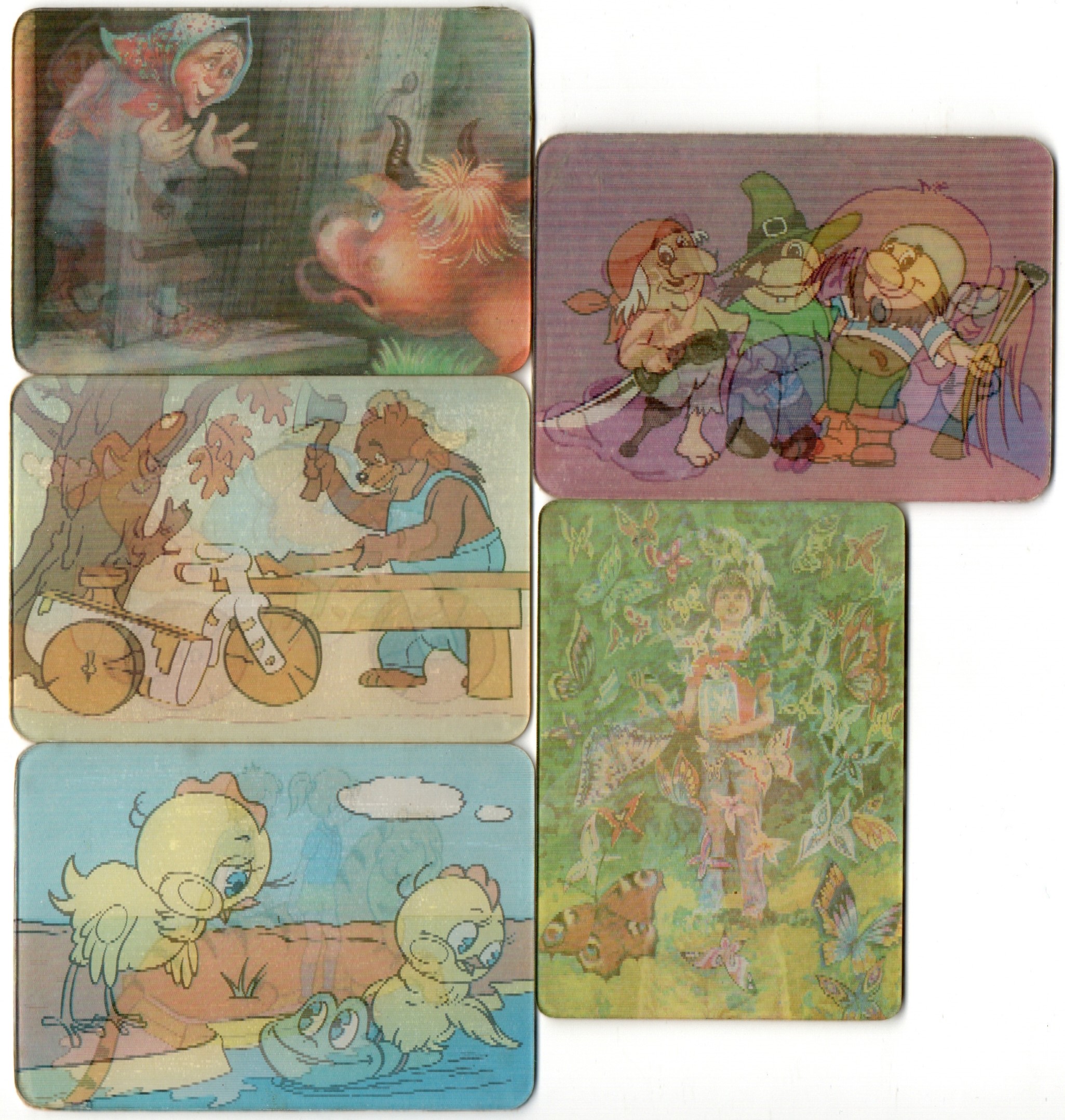 № 53 Набор из 5 стерео Календариков. Мультфильмы СССР 1990 - 1991 г. Стерео мультфильмы : Бабочка / Карпуша / Лиса и медведь / Два билета в Индию? / Пираты и девочка . Карманный календарик переливной объемный 3D. СССР. Художники СССР. Состояние на фото