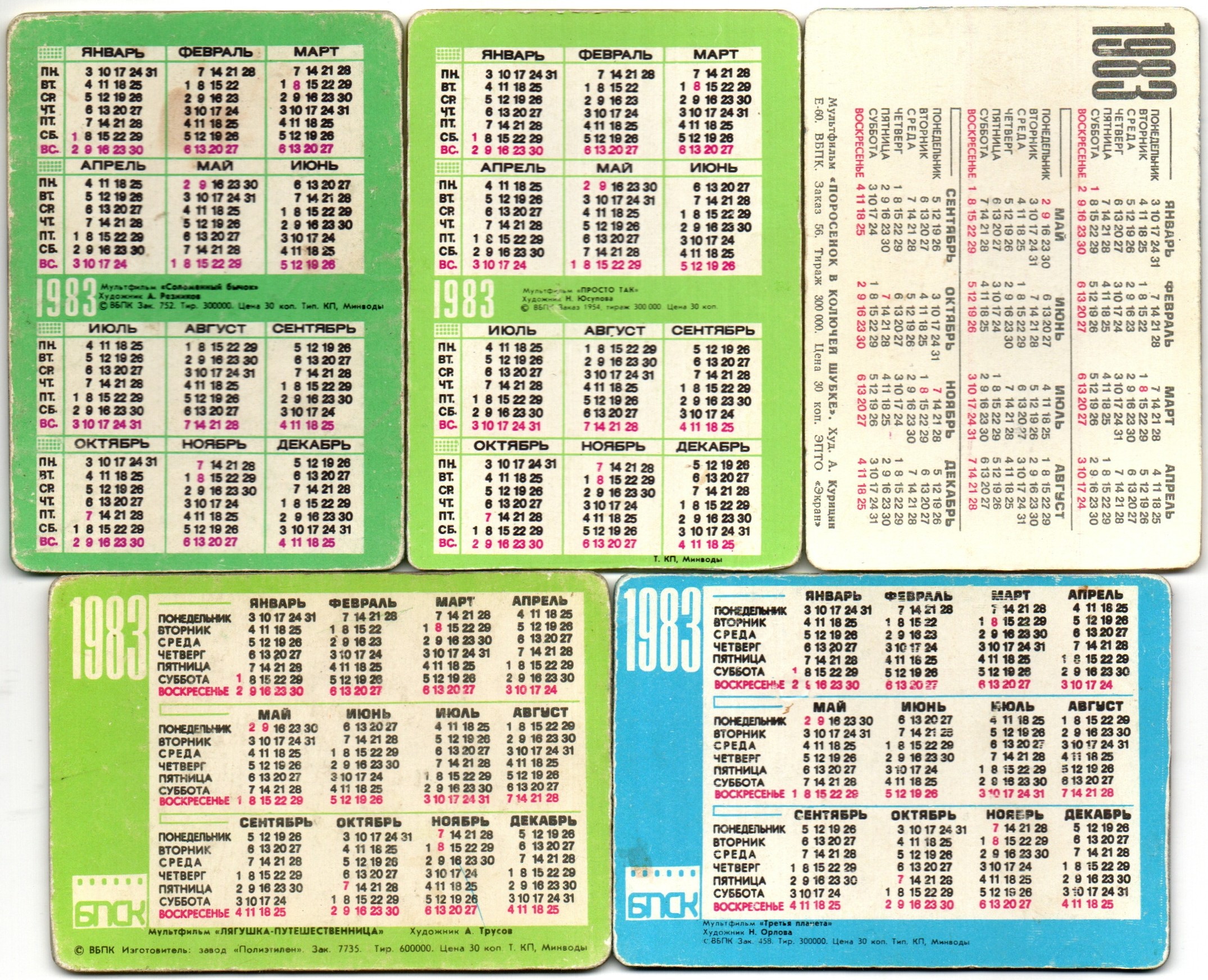 № 76 Набор из 5 переливных (стерео) Календариков . Мультфильмы СССР 1983 год.