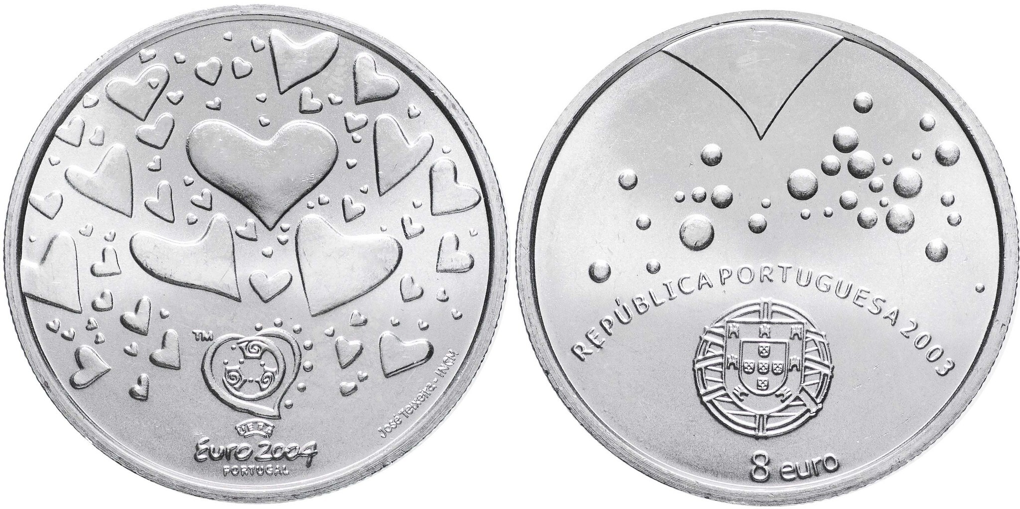 Аверс: внизу изображен герб Португалии. Под гербом указан номинал монеты. Над ним - надпись: "Республика Португалия 2003". Фоном для аверса служит большое сердце, от которого видно только верхнюю часть. В верхней части монеты отчеканены пузырьки воздуха, символизируя, что страна буквально дышит футболом.