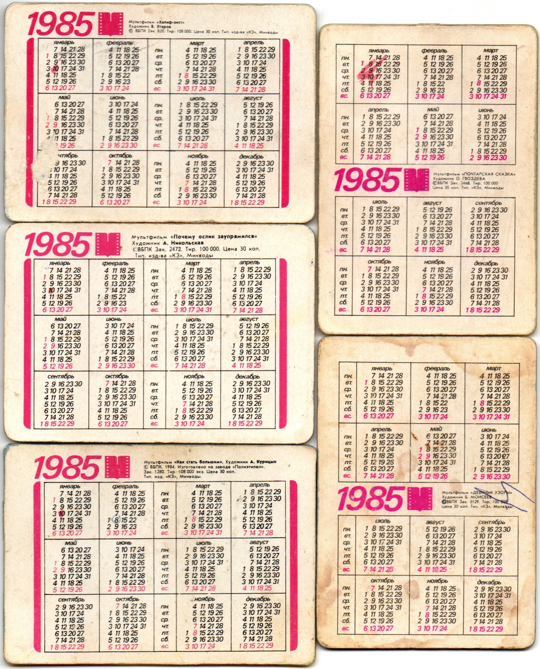 № 98 Набор из 5 переливных (стерео) Календариков . Мультфильмы СССР 1985 год.