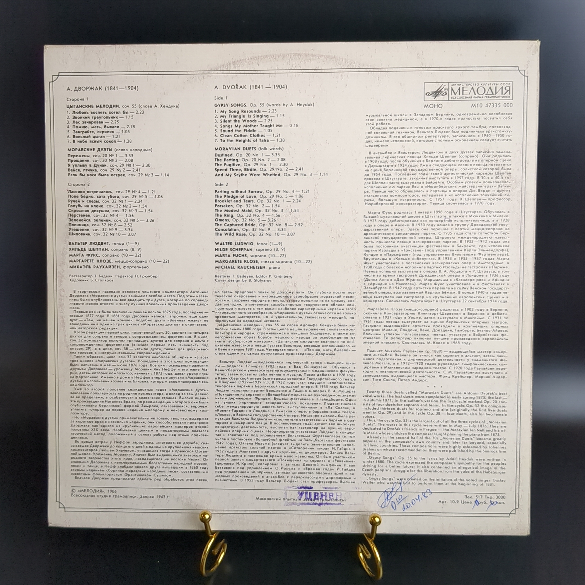 А.Дворжак виниловая пластинка 12 дюймов Цыганские мелодии/Моравские дуэты, LP, винтаж СССР Мелодия 1986 год