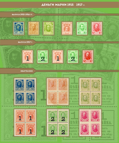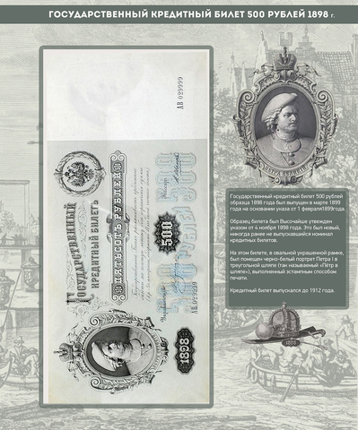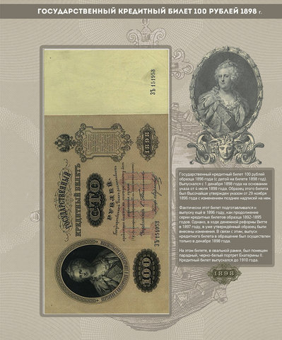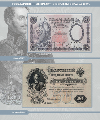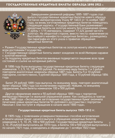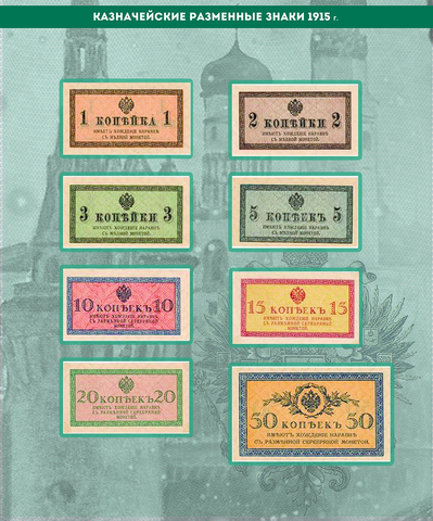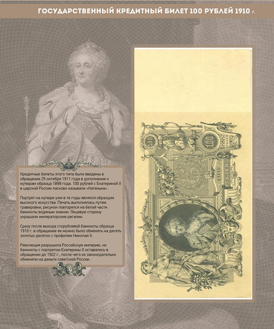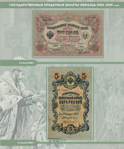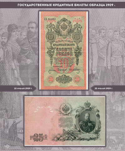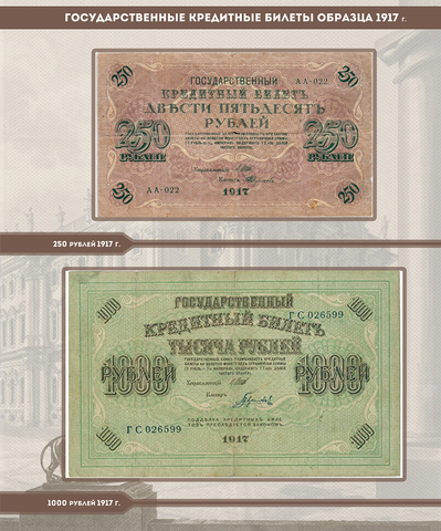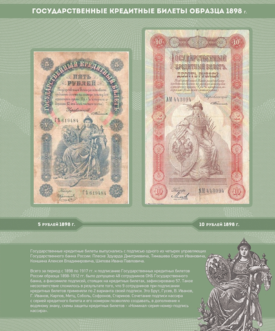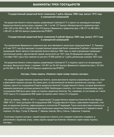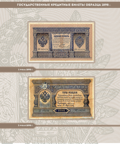 Издание включает место для всех банкнот Российской империи, выпущенных с 1898 года вплоть до Октябрьской Революции.