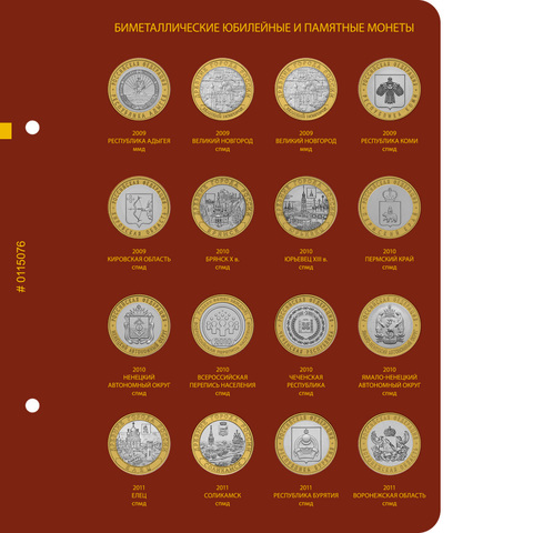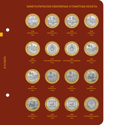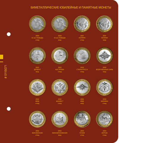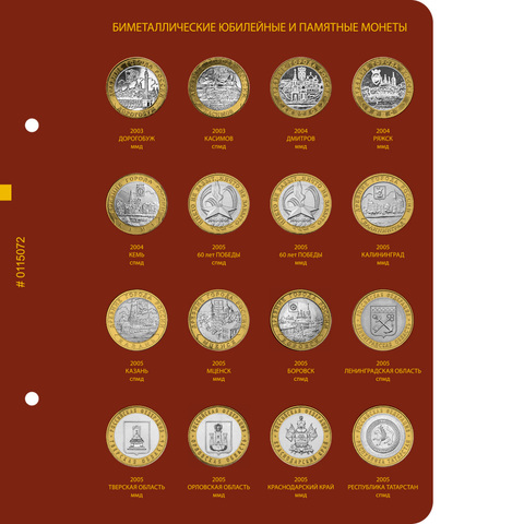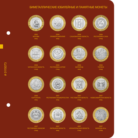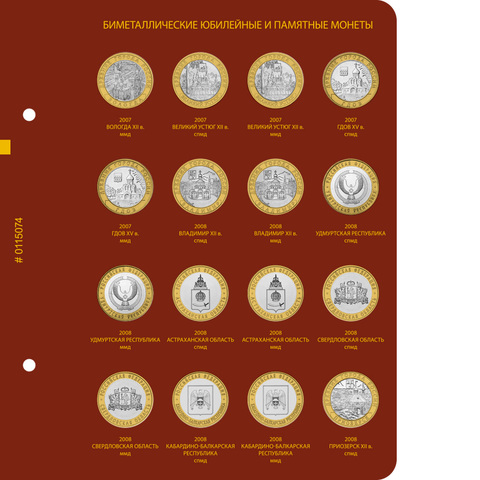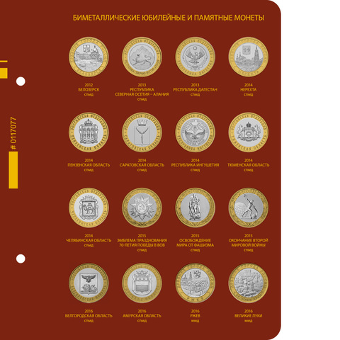 Альбом предназначен для размещения 10 рублевых биметаллических юбилейных и памятных монет России. К ним относятся серии «Древние города России», «Российская Федерация», «200-летие образования в России министерств», а также монеты, посвященные различным памятным датам.