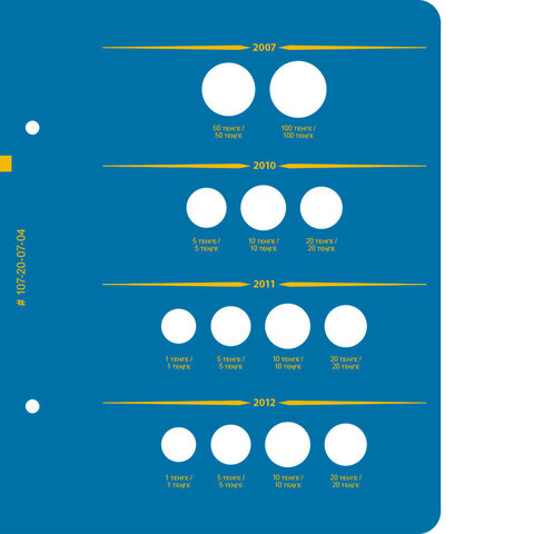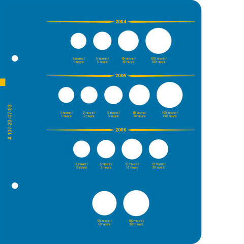 Монеты располагаются в соответствии с хронологией выпуска, годовыми комплектами. Сверху каждого годового комплекта указывается год выпуска, а под каждой ячейкой подписан номинал монеты и её признаки (если таковые есть), на двух языках (русском и казахском). В альбоме предусмотрен лист временного хранения с указанием номиналов, но без указания года выпуска.